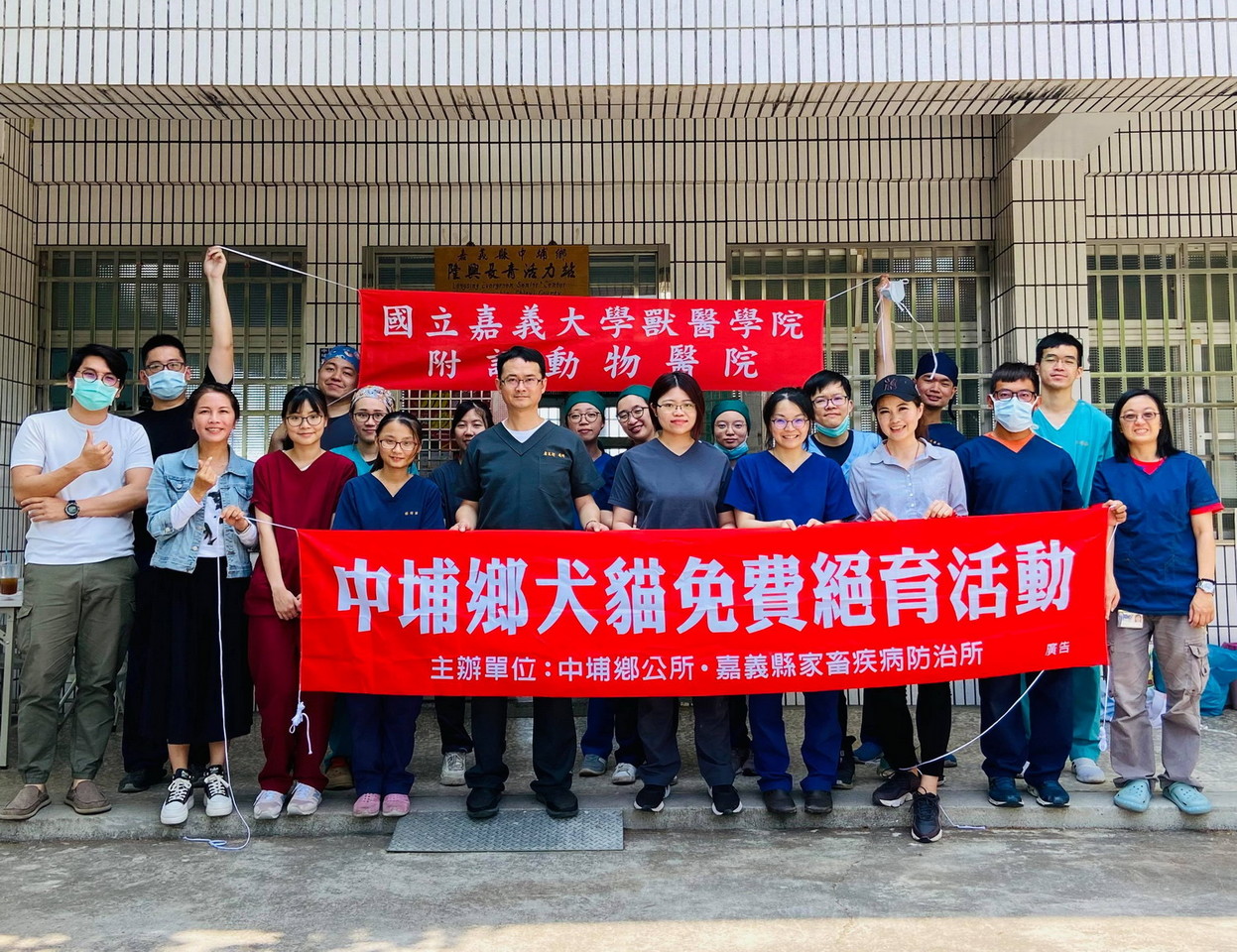 嘉大動物醫院專業醫療團隊,透過嘉義縣家畜疾病防治所安排,日前請中埔社區的志工及里民協助,帶著遊蕩動物至嘉義縣中埔鄉社區服務中心進行節育,減少因繁殖帶來的流浪動物社會問題,當日共為52隻動物節育,並宣傳如何預防人畜共通傳染病及飼養動物應定期定時施打疫苗及驅蟲計畫,希望社區民眾與遊蕩動物在專業獸醫輔助下都能受益。
