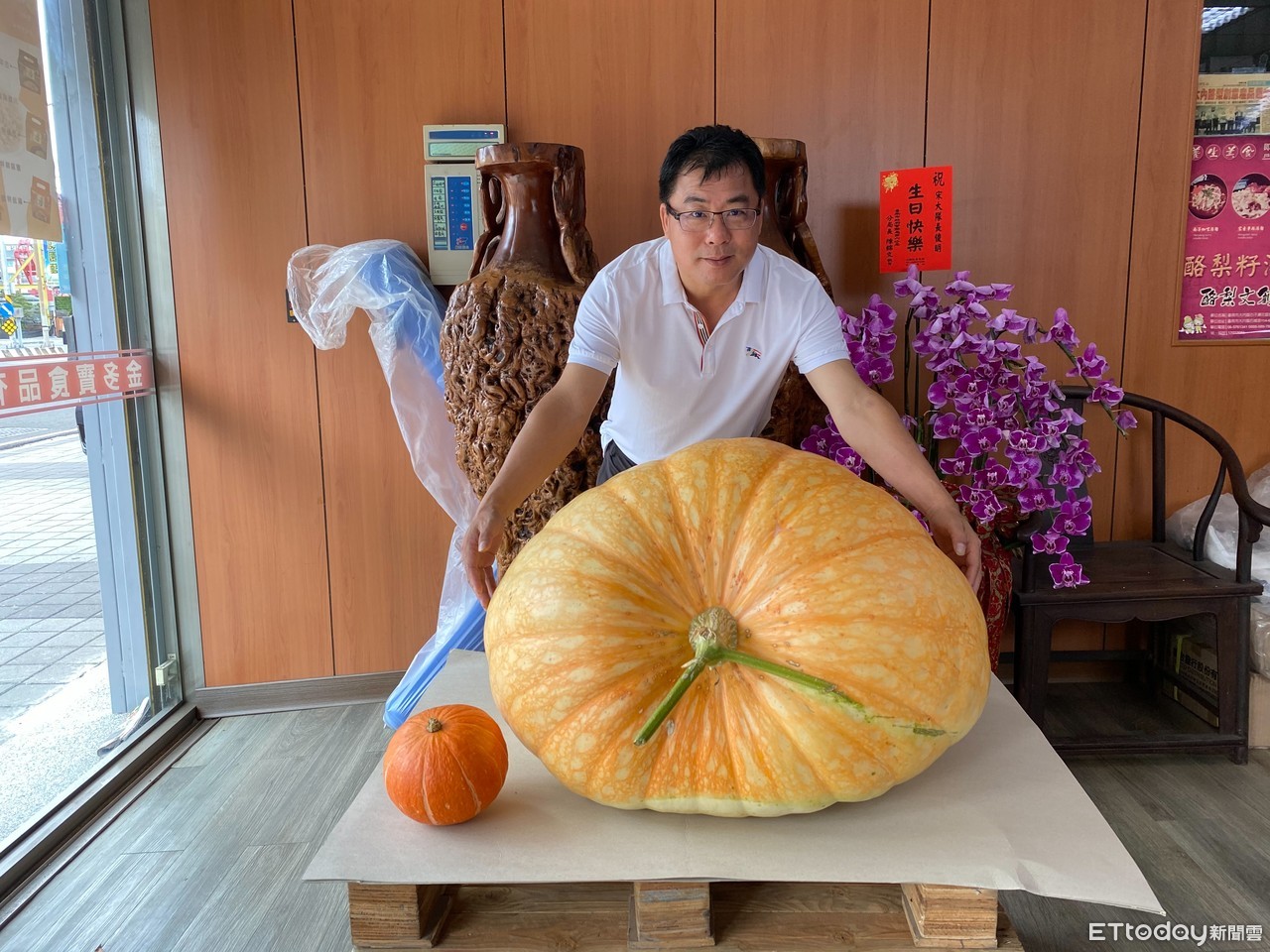 苗栗從事精緻農業的農民陳永章,種出3、4顆「巨無霸」超大南瓜,每顆重達200多斤,但卻苦無買主,恐會熟爛而丟棄,熱心公益的台南市守望相助巡守大隊大隊長宋俊明得知,立即掏腰包買下1顆,並從苗栗運回台南,還動用6個大男人合力才扛得動。