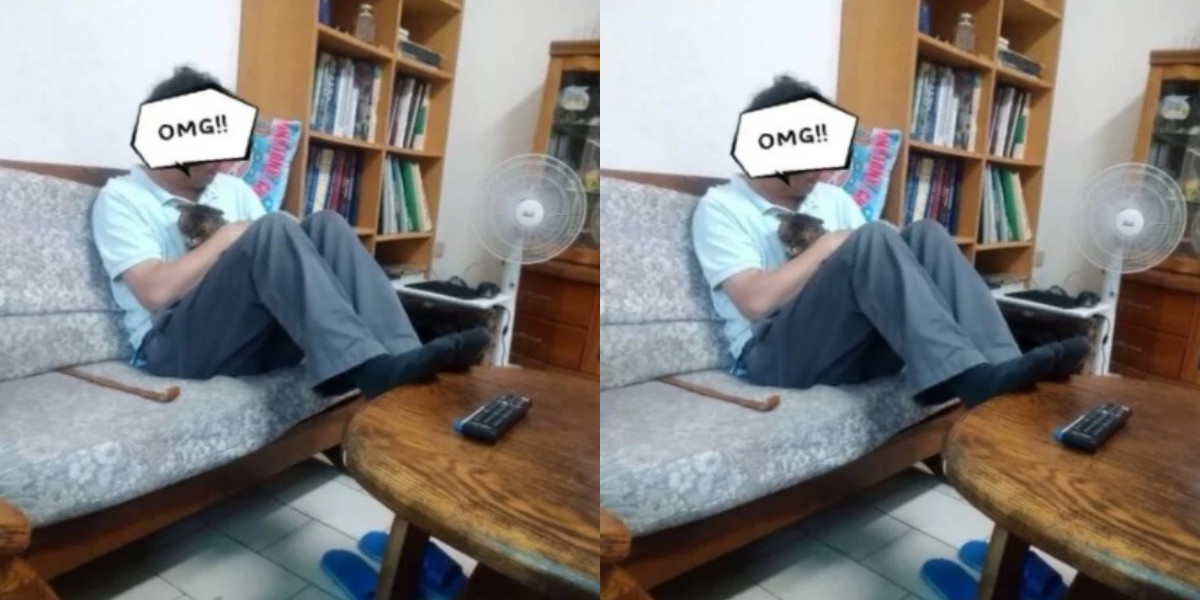 照片可見,爸爸弓著雙膝,低著頭不發一語,儘管臉上神情被圖片遮住,但連從喵喵憂鬱的表情來推測,當時氣氛肯定很沉重,「生人勿近!」而媽媽則在一旁目睹過程,也不禁感慨「只有張福氣(貓咪名字)能安慰到妳爸的心。」