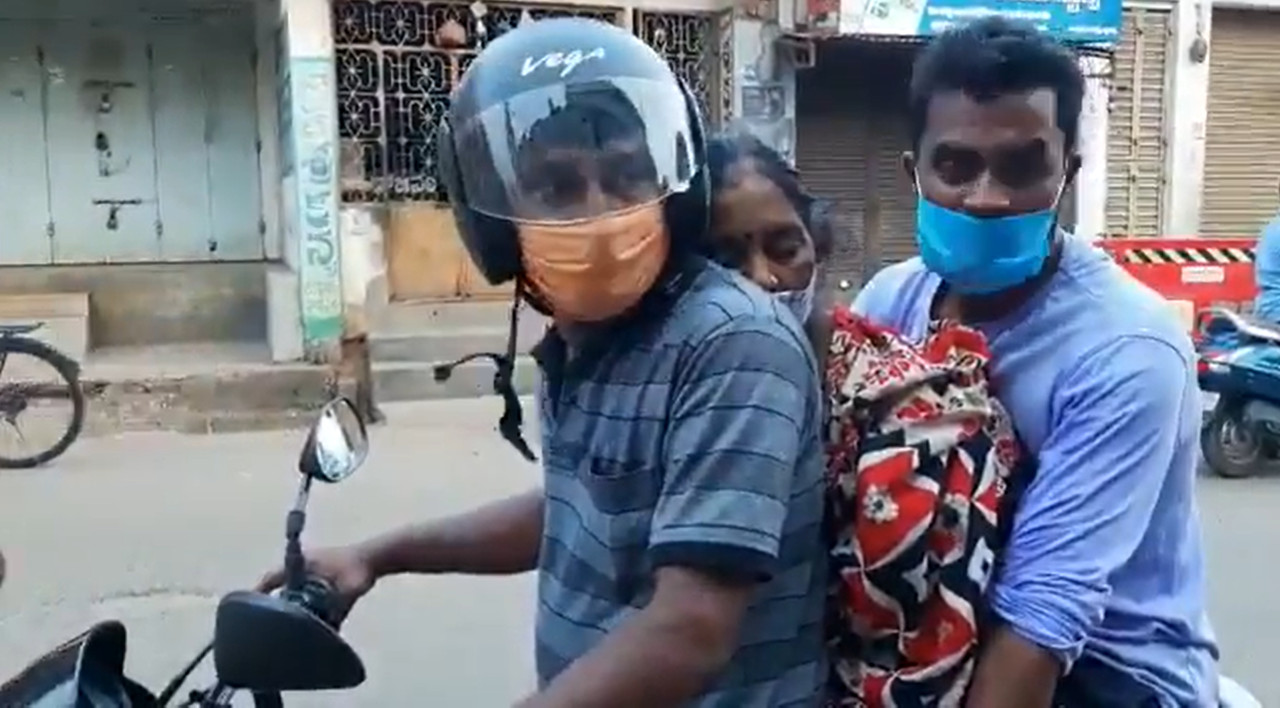 不過醫院的救護車現在也供不應求,死者家屬的請求遭拒,當地其他人也害怕在運屍過程中受感染,都不願意將家中的車輛借出。於是,死者的兒子決定用機車將母親遺體載往火葬場。他和死者的女婿一同合作,倆人一前一後地坐在機車上,並將遺體夾在中間,騎行20公里「運屍」。