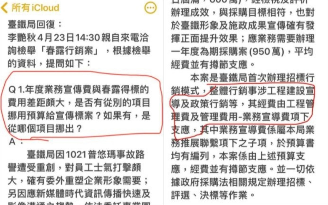 資深媒體人李艷秋爆料,她接到檢舉,台鐵連續不當挪用工程管理費,作為網軍的內宣費用,經向台鐵查證,台鐵承認花費1550萬,進行「工程建設及網路行銷採購案」,詳細查閱預算書後發現,台鐵110年的業務宣導費只有125萬,就算把宣導費全投入,至少要挪用1300萬的工程管理費。