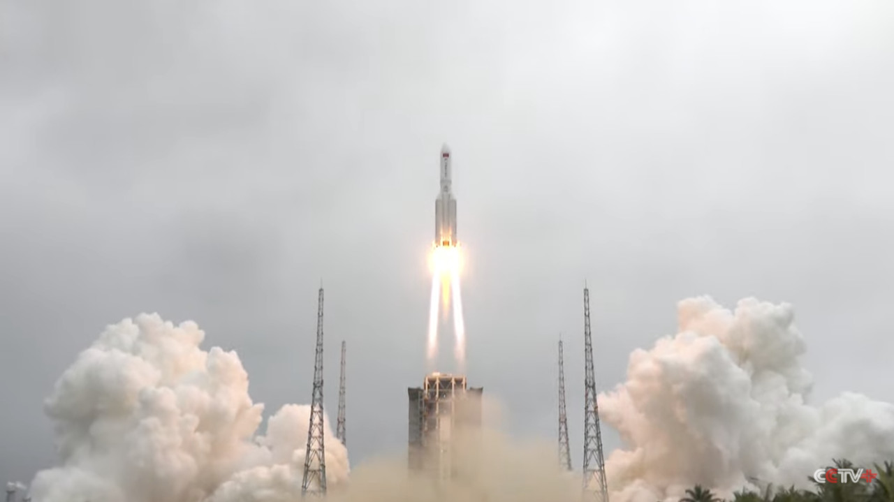 ▲大陸首座太空站主體「天和」核心艙4月29日於海南文昌航天發射場發射升空。(圖/翻攝CCTV+)