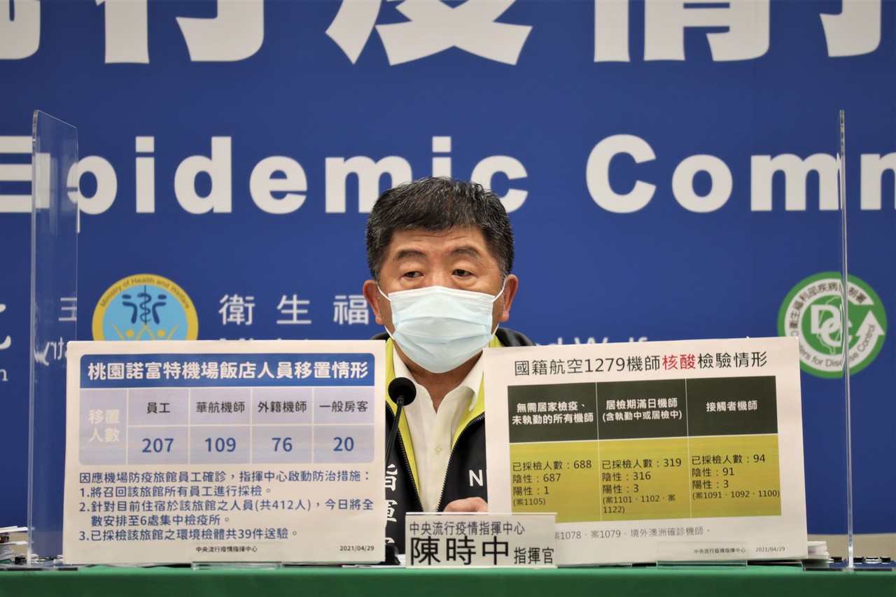 陳時中今早親自到諾富特飯店查看狀況,並親自廣播宣佈檢疫中的機組員全數移到集中檢疫所。下午也回到指揮中心親自說明情況,該名主管17日就在疫調裡面,調閱相關病例發現17日起就已經有相關症狀,目前包括足跡等活動史,都還在進行相關疫調。他也提到,該名主管發病有傳染力期,曾經有6位確診機師在那邊檢疫,包括案1079、1092、1101、1102、1105、1122。