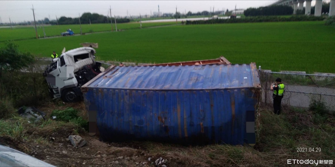 ▲國道一號北斗段傳貨櫃車翻落邊坡,2人送醫。(圖/國道第三公路警察大隊提供)