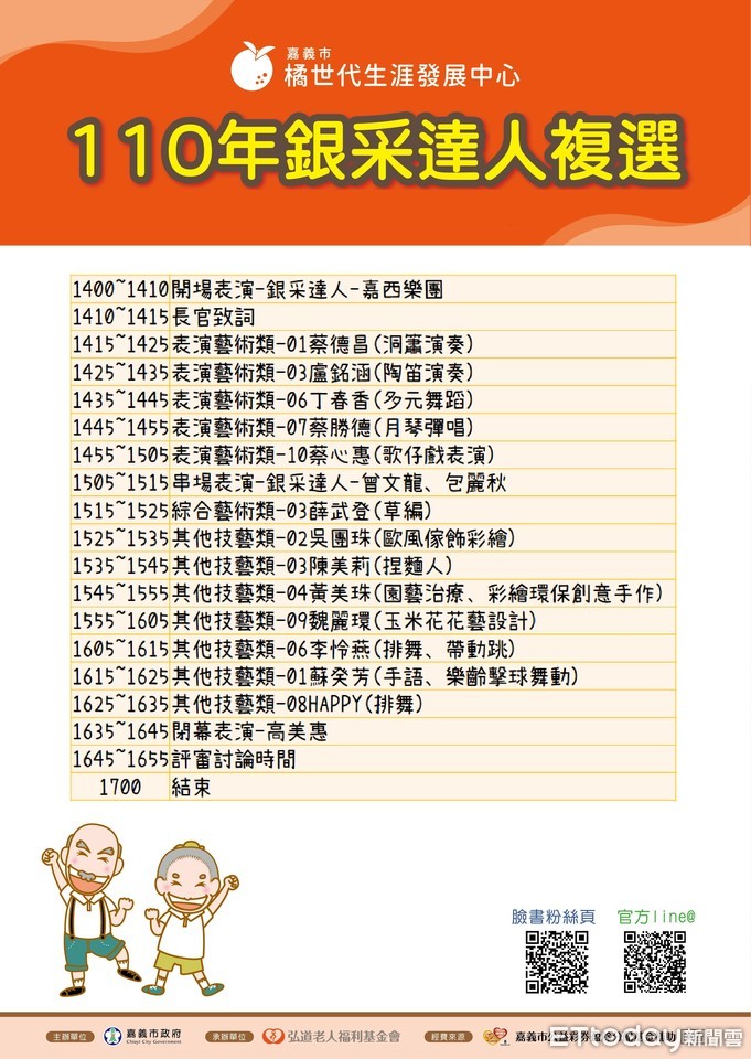 橘世代生涯發展中心說明,今年與往年最大不同之處在於將複選舉辦在嘉義市文創園區藝術大道,期望此次入選者能在戶外大型公開舞台上盡情表現,也讓來往的民眾欣賞他們最完美的演出,同時,亦能透過本次的公開評選,展現出嘉義市對於活躍老化的推動與重視。同時,也會安排原有的銀采達人的技藝表演,讓他們有更多展現自我的機會。接下來,中心也將針對原有暨新入選的銀采達人辦理銀采達人培訓說明會,培訓課程除了表演口條、主持訓練等,也將透過數位科技3C產品的課程,讓銀采達人藉由全方面的學習,發掘並對大眾展現自我的優勢。期望透過中心一系列的學習安排,讓徵選而出的銀采達人,能發揮自身最大價值,也能有更多機會讓大眾看見不一樣的精彩老後。也歡迎各界與中心連絡,邀請銀采達人至各單位進行教學或演出,連絡電話:05-3103612。