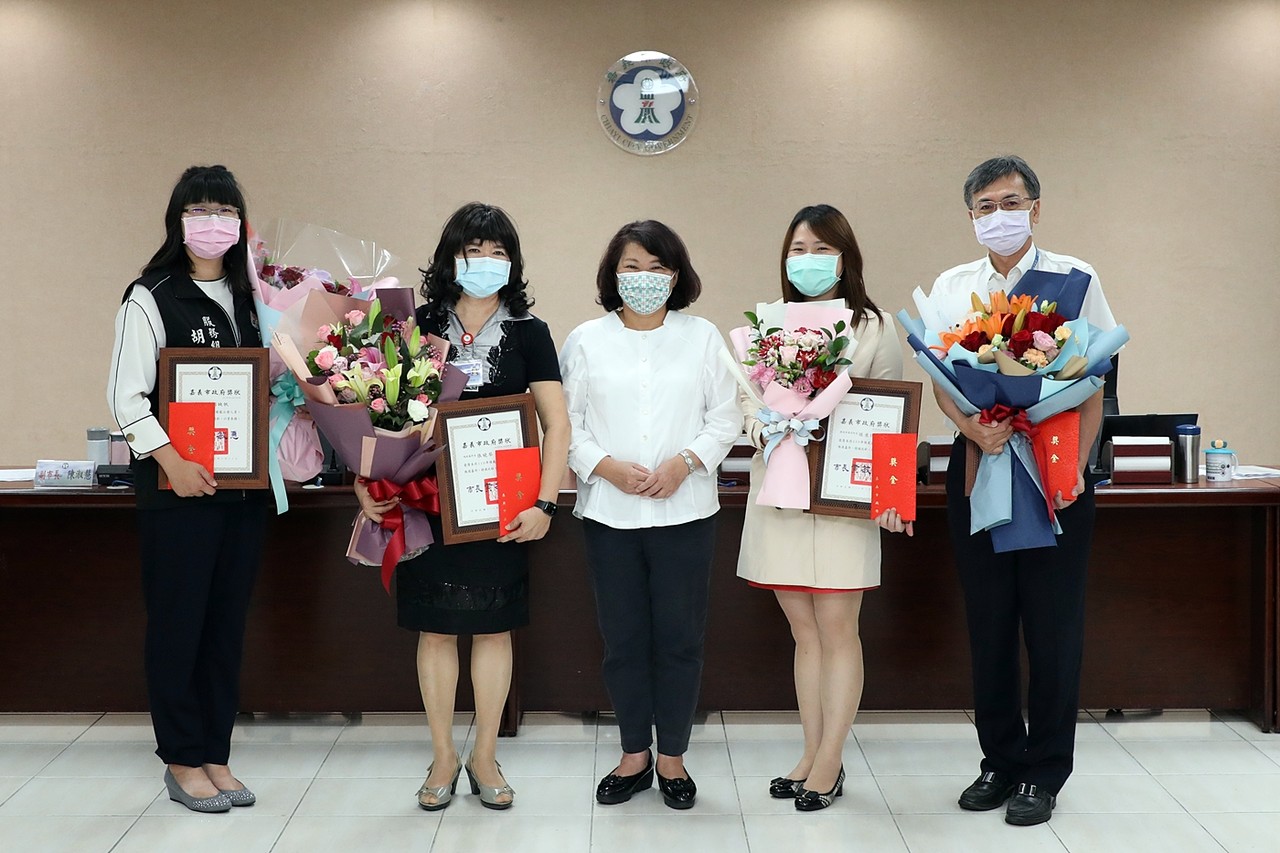 嘉義市政府市務會議,黃敏惠市長頒獎表揚110 年模範公務人員:環境保護局科長孫意惇、交通處處長鄭君健、殯葬管理所辦事員胡映帆及地政處科長張曉琴。黃敏惠市長說,謝謝大家的付出與奉獻,這就是有溫度的戰鬥團隊,大家一起攜手同心,把市政工作越做越好,讓嘉義市越來越幸福。