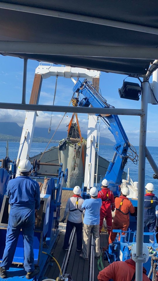 ▲空軍司令部證實,去年由飛官朱冠甍駕駛失事的F-5E戰機打撈上船。(圖/空軍司令部提供,下同)