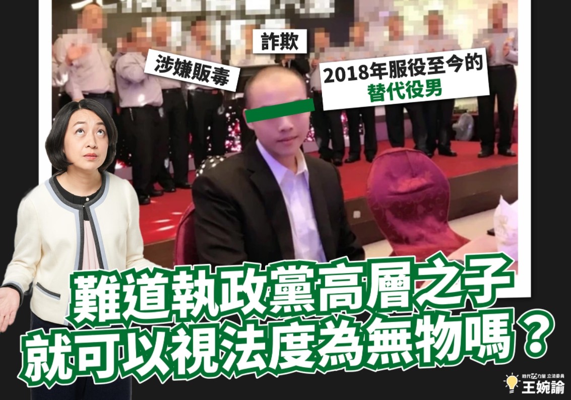 民進黨台北市黨部評委會召集人趙映光29歲兒趙介佑醜聞連環爆,他自2018年5月14日入伍擔任替代役,不僅因缺勤太多遭法辦,至今仍是逃兵狀態,甚至在澎湖監獄服替代役期間,曾對役男管理人員恐嚇「絕對殺了你」。對此,時代力量立委王婉諭感嘆,內政部跟役政署根本應該整組打掉重練,而台北市府更嚴重缺乏管理監督之責、助紂為虐。