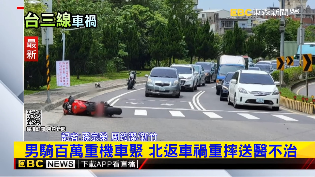 新竹橫山台三線69.5公里處1日發生死亡車禍,一名陳姓男子剛參加完重機車聚,騎著要價百萬的紅色杜卡迪返家途中發生意外,警消到場時已無呼吸心跳,送醫不治身亡。警方表示,現場沒有監視器,因此詳細肇事原因還有待釐清。