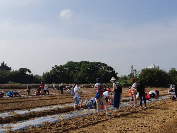 ▲桃園「來鄉下種西瓜」活動,市長鄭文燦、議長邱奕勝和參加人士同心協力種瓜。(圖/市府提供)