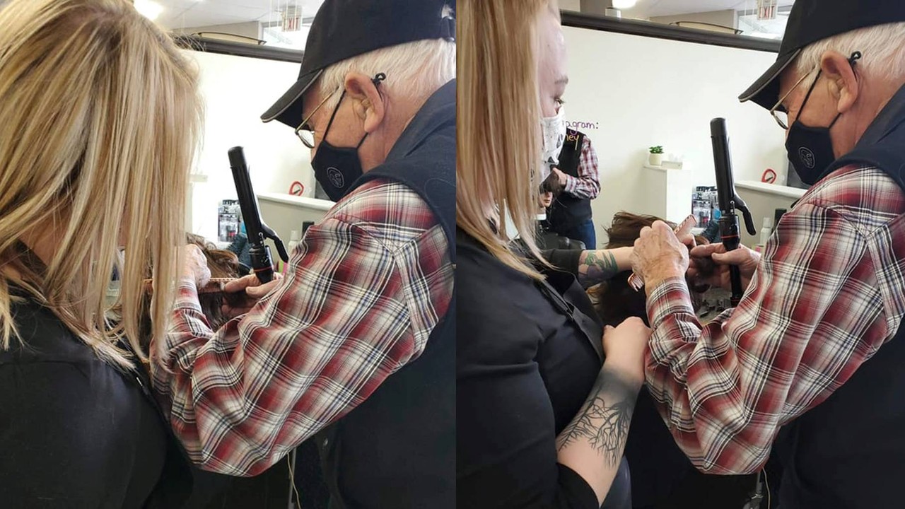 ▲爺爺向美髮師學習如何正確使用電捲棒。(圖/翻攝自Facebook/Hair Design By Britney)