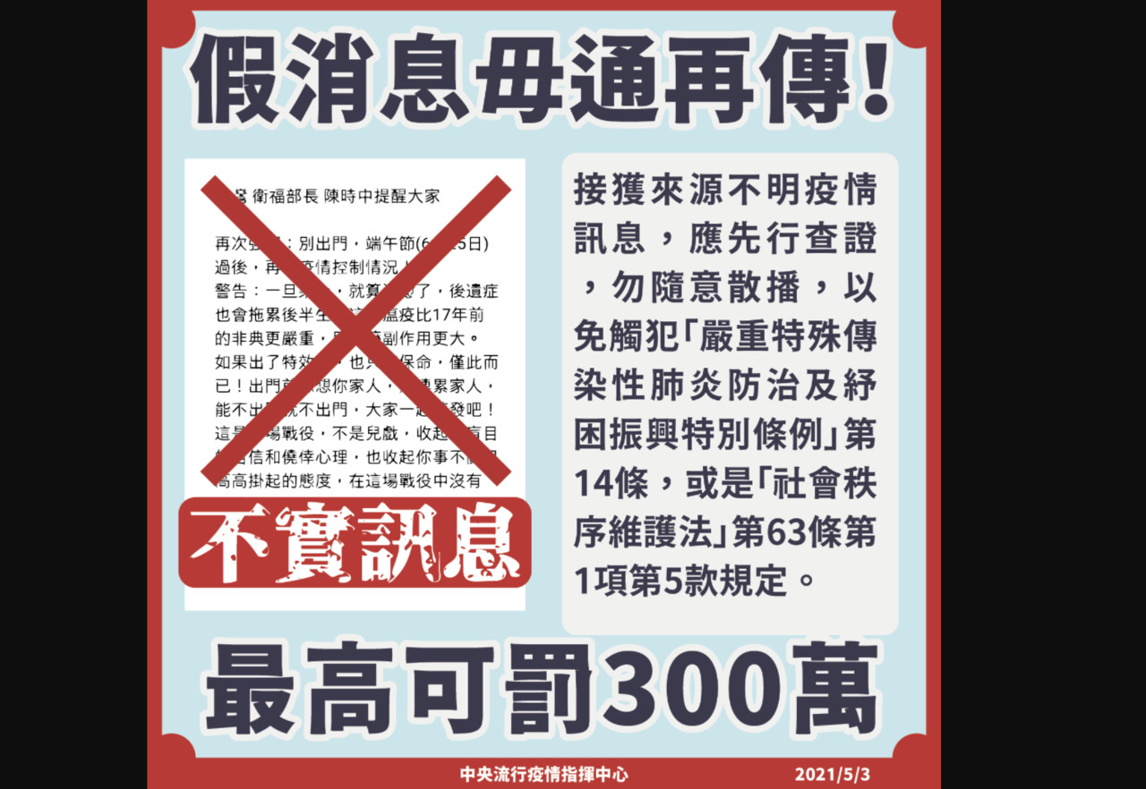 網路上流傳一則訊息指出「 再次強調:別出門,端午節(6月25日)過後,再看疫情控制情況!警告:一旦染上,就算治癒了,後遺症也會拖累後半生!……在這場戰役中沒有局外人!在家!在家!在家!不要點贊!求轉發! —陳時中」。對此中央流行疫情指揮中心嚴正澄清,相關訊息是錯假訊息,請民眾勿再轉傳與散布,以免觸法遭罰。