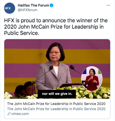 ▼北美最大安全論壇「哈利法克斯論壇」4日正式宣佈,頒發「馬侃公共事務領袖獎章」給總統蔡英文。(圖/哈利法克斯論壇推特)