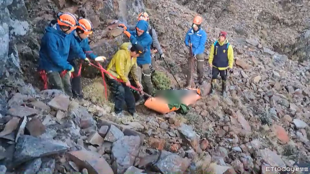 ▲搜救隊員一早將徐男遺體搬運至品田山三角點,等待直升機吊掛下山。(圖/記者黃孟珍翻攝)