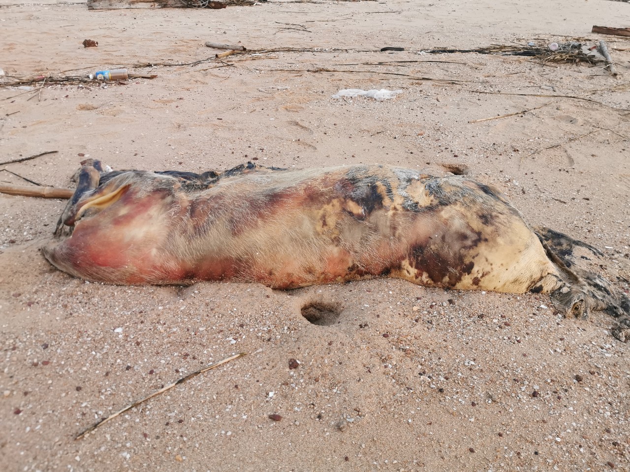▲金寧鄉烏沙頭海灘大陸海漂豬檢出非洲豬瘟病毒核酸陽性 。(圖/記者林名揚翻攝)
