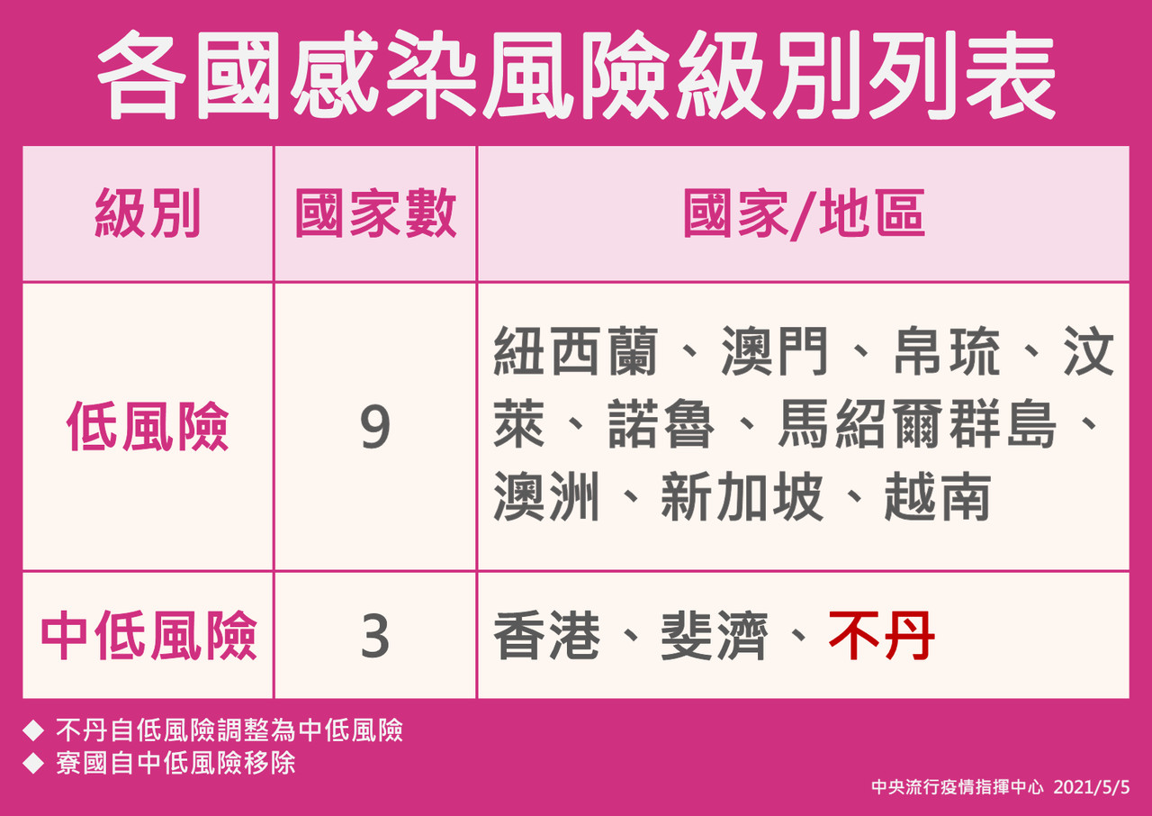 低感染風險國家/地區:紐西蘭、澳門、帛琉、汶萊、諾魯、馬紹爾群島、澳洲、新加坡、越南。