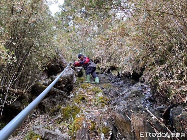▲旱象未解導致山屋缺水,圖為排雲山莊人員接管引水情形。(圖/玉山國家公園管理處提供)