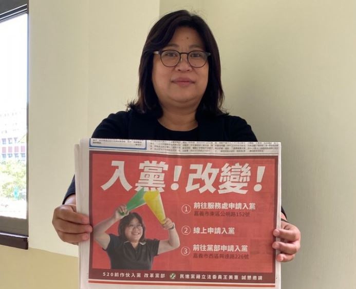 王美惠指出,今年2月1日,她就任立委滿一週年,那時就積極招募民眾入黨,希望民進黨在嘉義市的發展更茁壯,更希望能聽取更多元的聲音,但初衷卻遭市黨部抹黑且百般阻撓,今天的廣告代表她改革市黨部屹立不搖的決心,誓言不讓市黨部繼續成為家族企業。