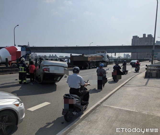 台一線中山橋往台北方向10日上午發生一起車禍事故!現場一輛砂石車與自小客發生碰撞,猛烈撞擊力道導致自小客當場翻覆,現場僅剩1車道通行,造成車流嚴重回堵,至少塞了近2公里。警消人員目前正積極排除事故中,所幸車禍並無造成人員傷亡,而至於詳細事故原因仍有待調查釐清。