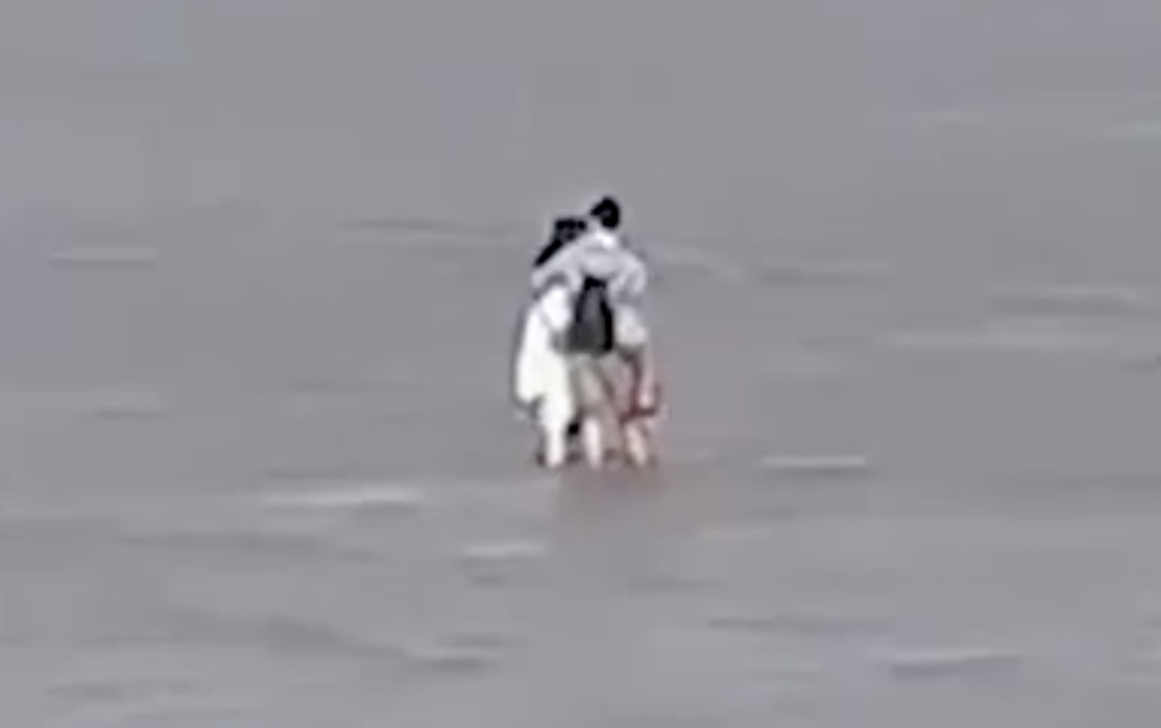 從岸上遊客拍攝的影片可以看見,當時正處於漲潮,沙灘的水位越來越高,遊客們都已經撤回岸上,但有一對情侶卻仍在沙灘上陶醉擁吻,無視海水已經淹至小腿位置。