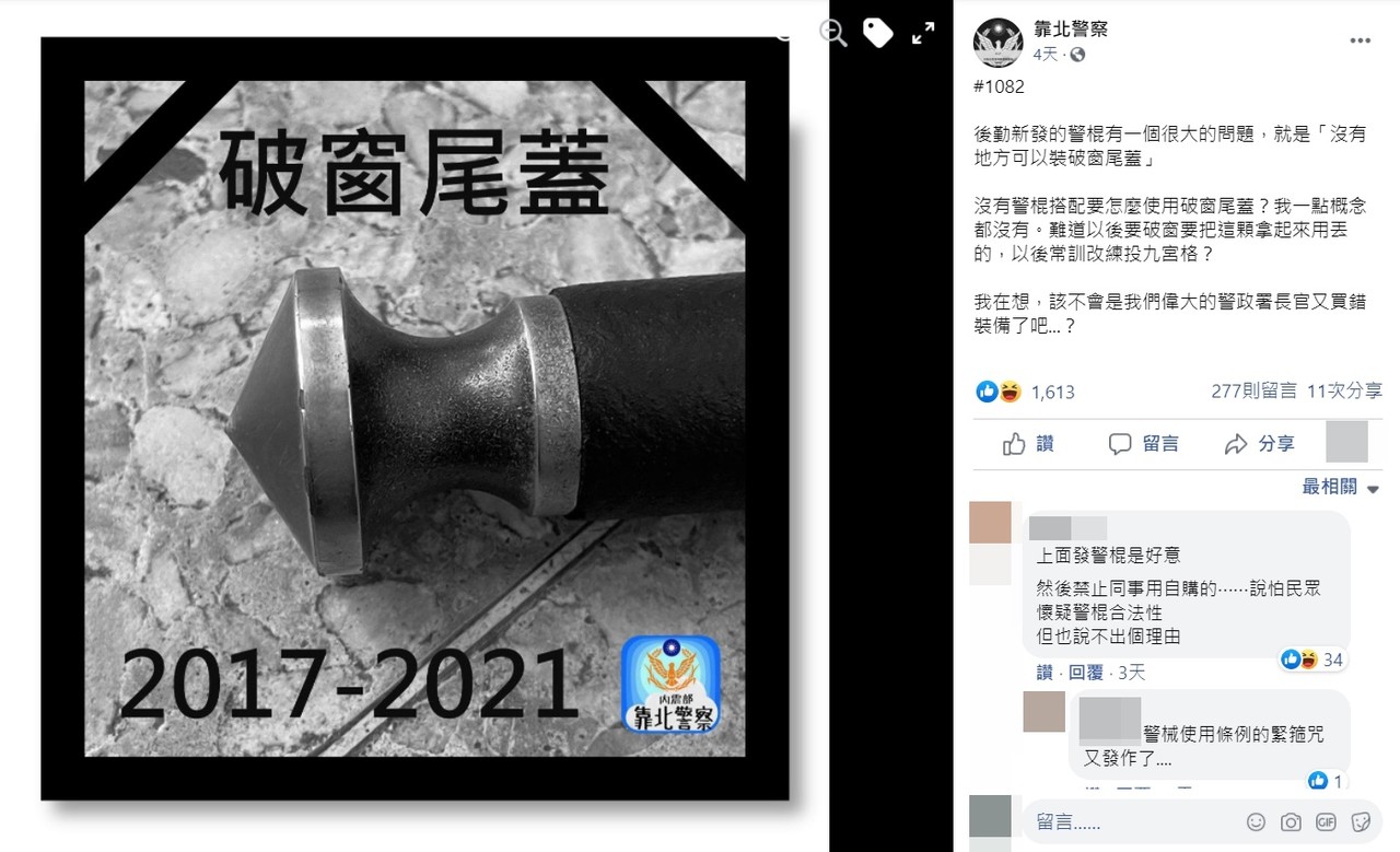 臉書粉絲專頁《靠北警察》6日一篇PO文指出,「後勤新發的警棍有一個很大的問題,就是『沒有地方可以裝破窗尾蓋』,沒有警棍搭配要怎麼使用破窗尾蓋?我一點概念都沒有。難道以後要破窗要把這顆拿起來用丟的,以後常訓改練投九宮格?」。