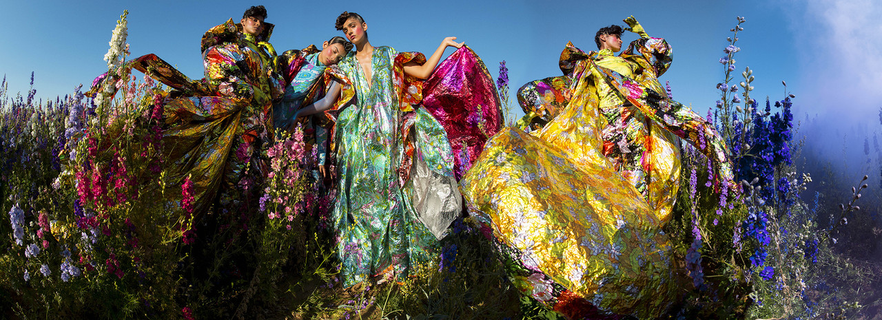 ▲蒂姆.沃克「雲朵9」系列作品,拉迪卡.奈爾、尚特爾.庫爾卡尼與基蘭.肯德拉;時裝:Richard Quinn;伍斯特郡珀肖爾鎮2018。圖片來源:Tim Walker Studio