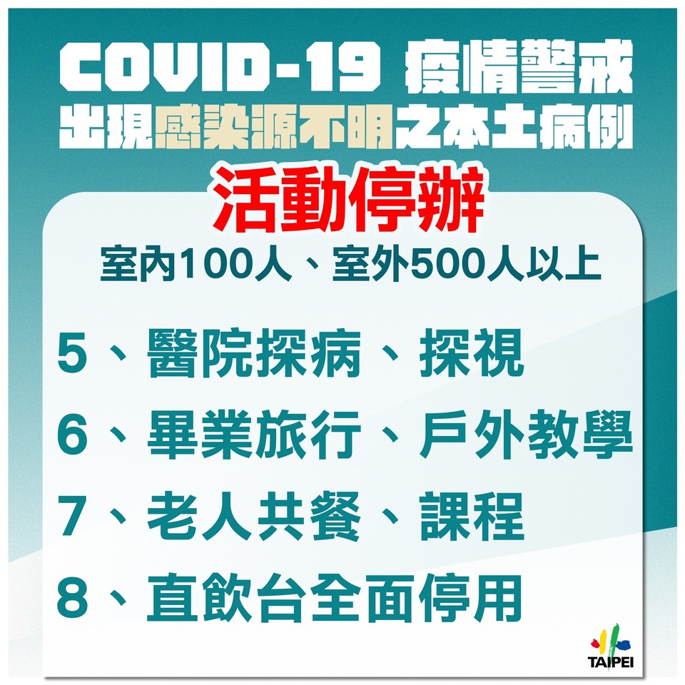 此外,北市禁止醫院探病和老人機構探視按中央規定,延長至6月8日;畢業旅行延後、戶外教學暫停;老人共餐和課程暫停;台北市直飲台全面停用。