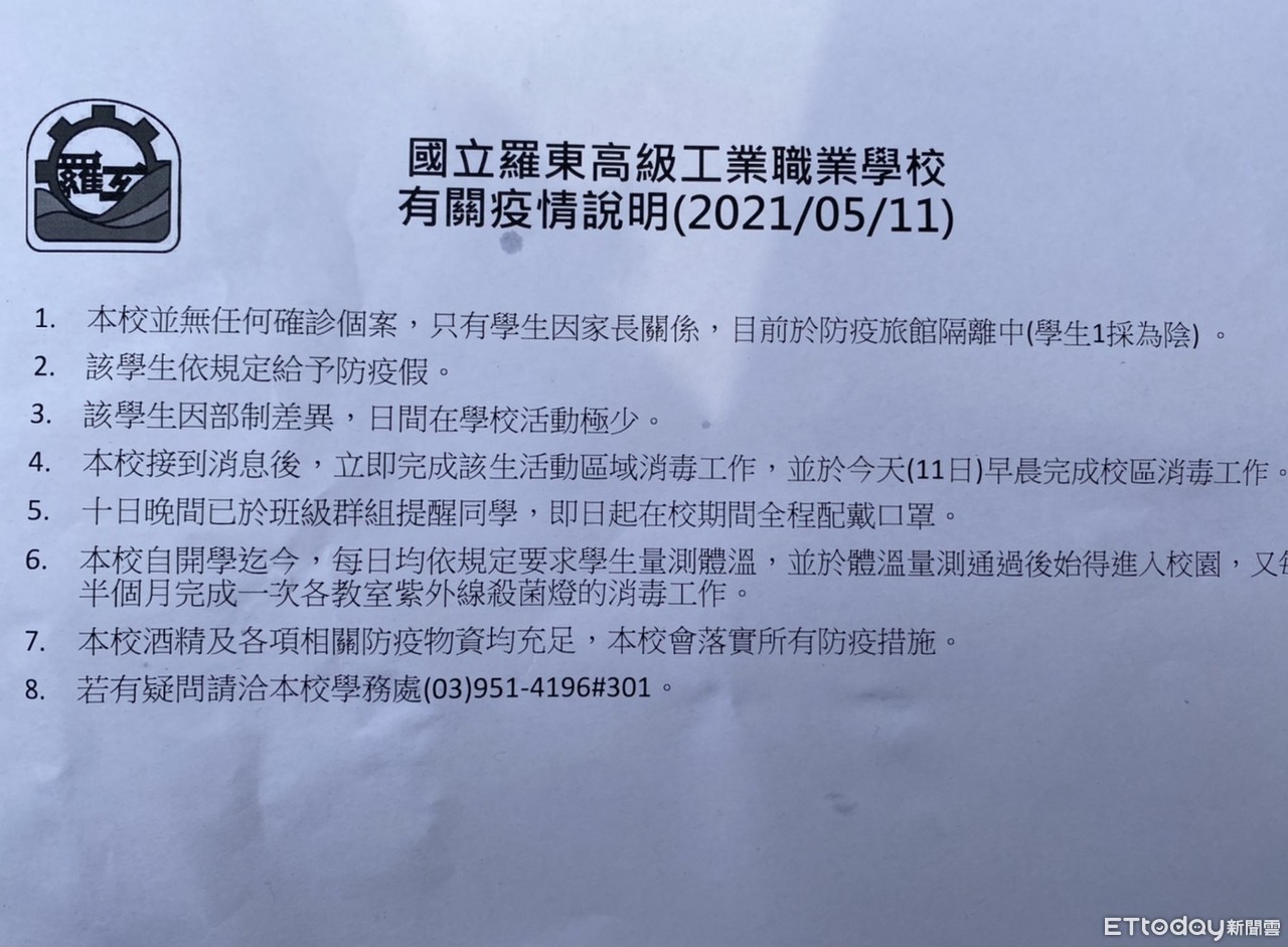 中央疫情指揮中心11日宣布新增7例新冠肺炎本土案例,其中5例在宜蘭羅東,案1202因在羅東中正北路「銀河百家樂」遊藝場工作,是最早的發病者,更驚傳附近某高中有學生家長在確診遊藝場上班。羅東高工對此緊急表示,本校無任何確診個案,僅有學生因家長關係在防疫旅館隔離中,且該名學生1採陰性,也立即在校園內展開消毒作業。