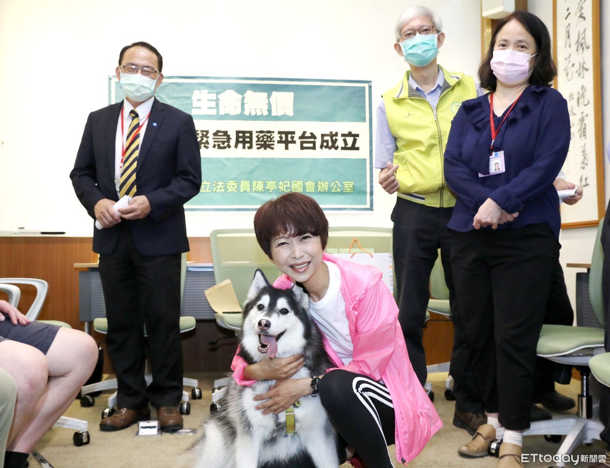 陳亭妃11日上午與獸醫師公會全國聯合會理事長譚大倫、台中市獸醫師公會理事長劉彥傑、台灣動物保護行政監督聯盟秘書長何宗勳等人在立法院召開「生命無價! 毛小孩緊急用藥平台成立!」記者會。