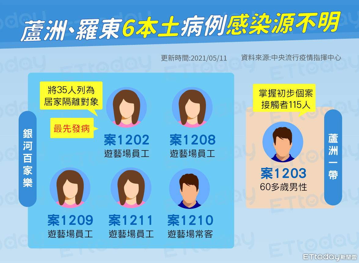 中央疫情指揮中心今(11)日公布新增7例本土案例,有6例感染源不明,其中案1202為羅東遊藝場女員工,與同事案1211前後到同家醫院急診,醫師機警揪出遊藝場共5人染疫;另一名則為新北蘆洲60多歲男子,接觸者匡列破百人。而華航群聚案也新增一例確診,案1201是染疫機師案1187的家人。因應社區傳播風險升高,指揮中心也宣布提升疫情警戒至第二級。