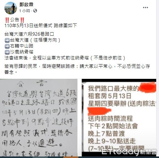 里長鄭啟霖也緊急在臉書上公告時間與路線圖,下午兩點開始法會、晚上七點普渡、晚上9點到10點送走。路線則由台灣大道六段926巷路口往梧棲方向右轉中山路,隨後前往納骨塔,法會結束後,全程都會以坐車方式前往納骨塔,強調非徒步前往,若有忌諱的民眾,也請屆時避開該路段。