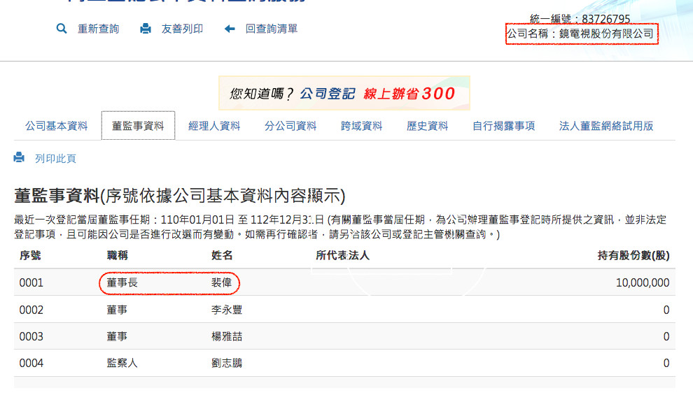 ▲裴偉請辭鏡電視董事長,鏡電視向NCC申設新聞台案可能生變。(圖/翻攝經濟部商工登記)