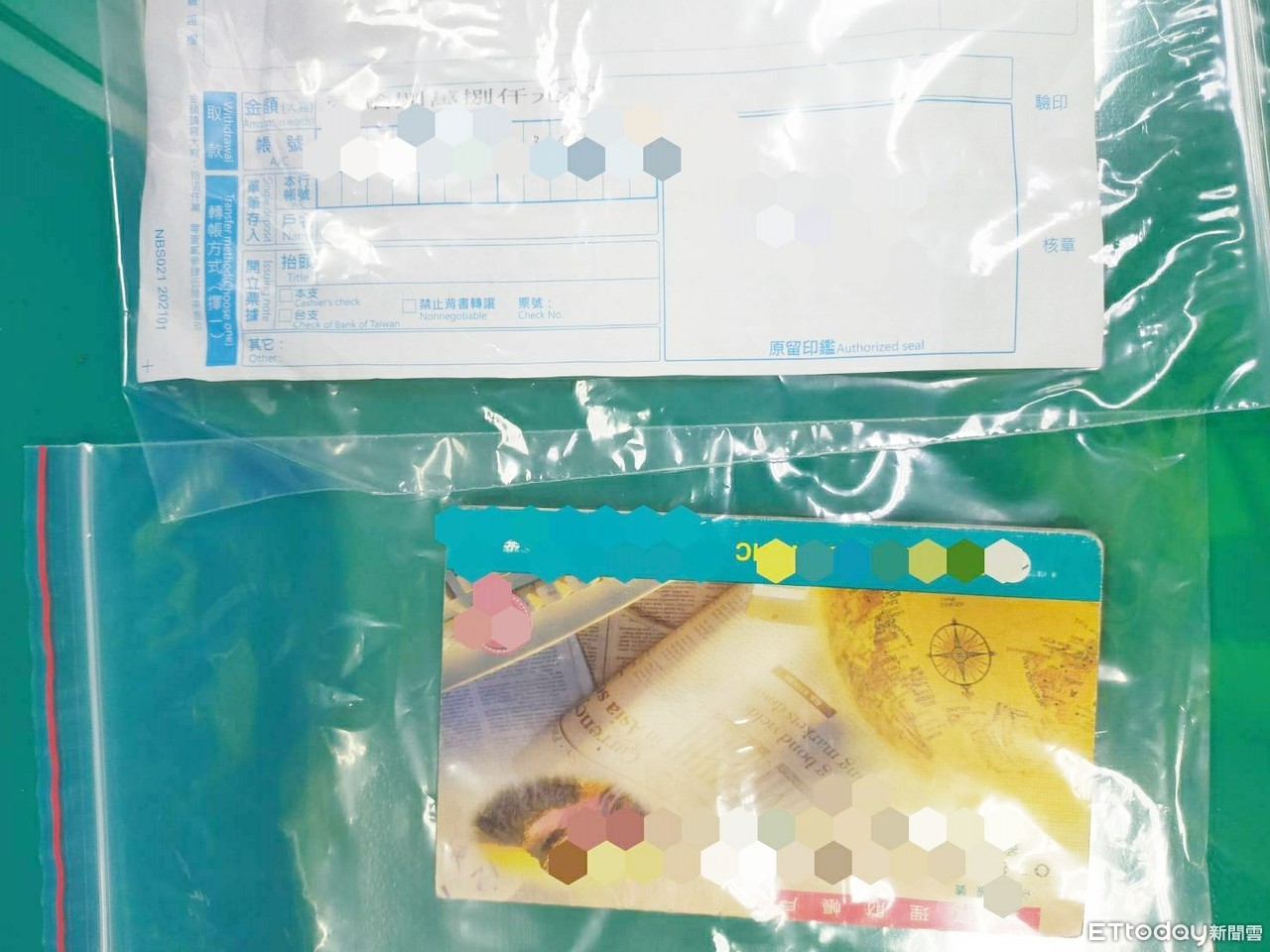 ▲桃園警分局11日下午在轄區內某銀行查獲盧姓男子臨櫃領取20萬元詐騙得來款項,圖為銀行存簿等證據。(圖/記者沈繼昌翻攝)
