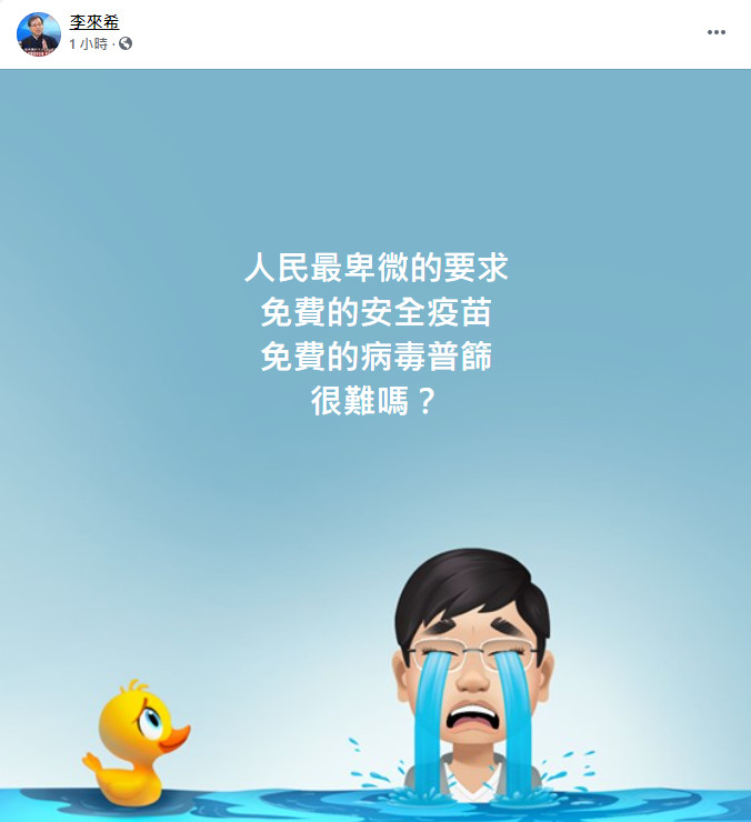 對此,李來希感嘆,「人民最卑微的要求,免費的安全疫苗、免費的病毒普篩,很難嗎?」