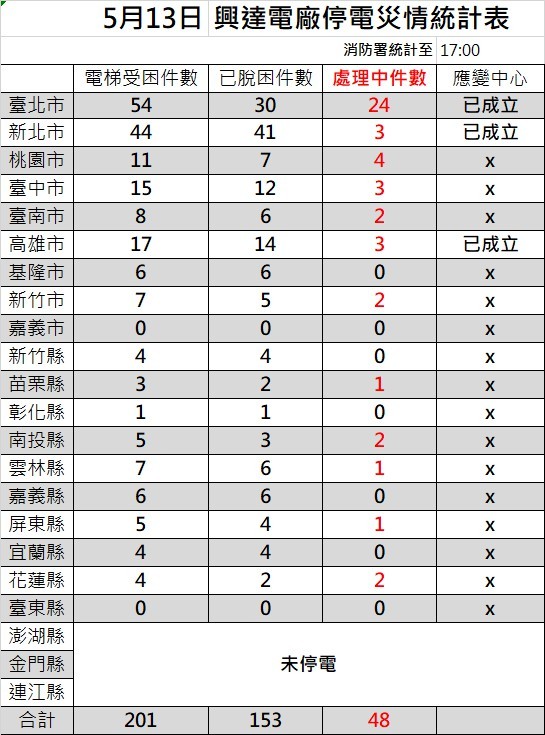 高雄興達電廠13日下午2時37分因事故全廠停機,全台陸續傳出停電災情,台電下午3時開始執行緊急分區輪流停電。內政部消防署指出,截至17:00各消防機關回報,全國計201件電梯受困,其中153件脫困,48件處理中,其中包括台北市24件、新北市3件、桃園市4件等。