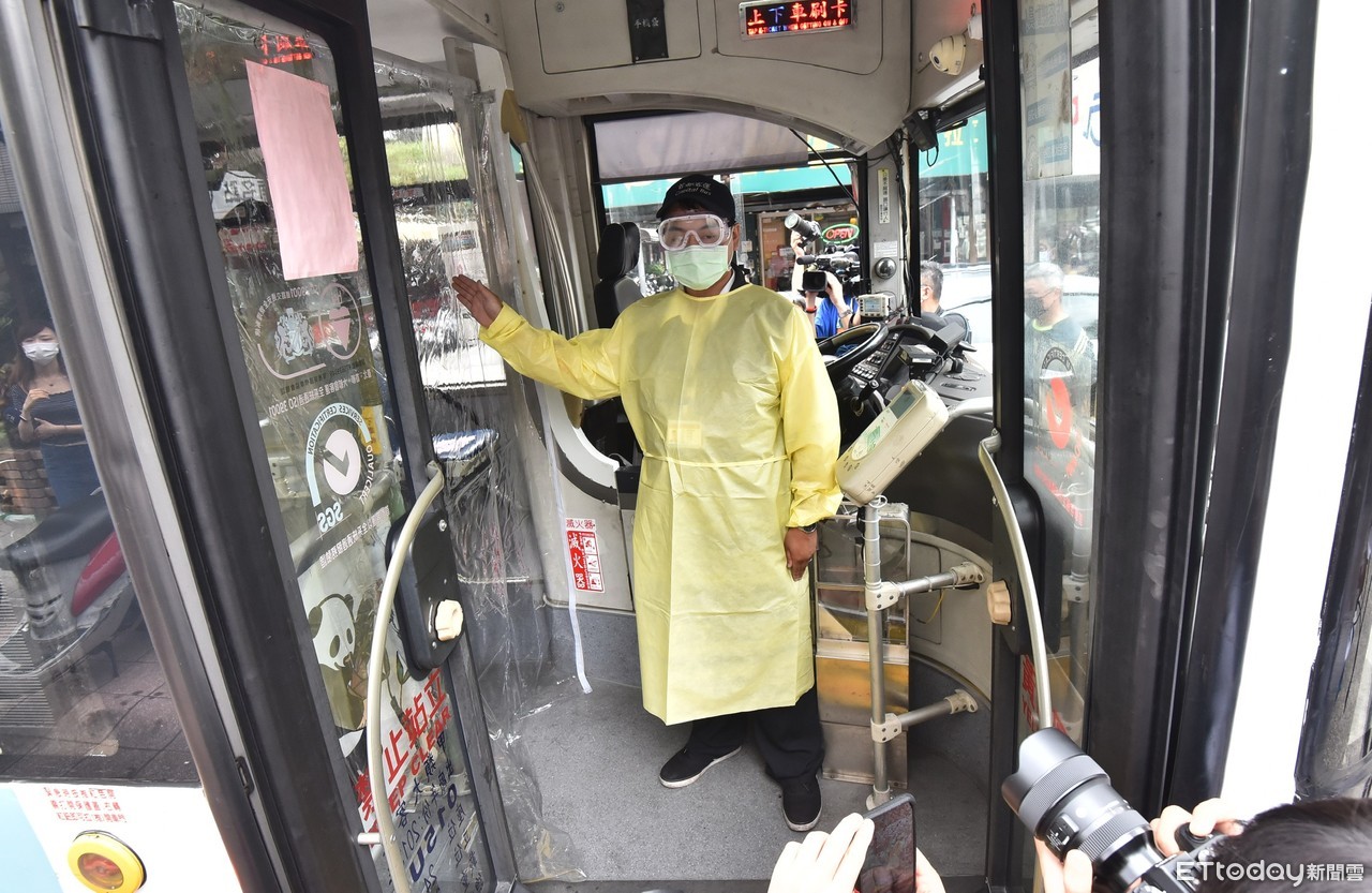 ▲ 防疫巴士司機全身穿好防護衣並戴好口罩帽子護目鏡。(圖/記者李毓康攝)