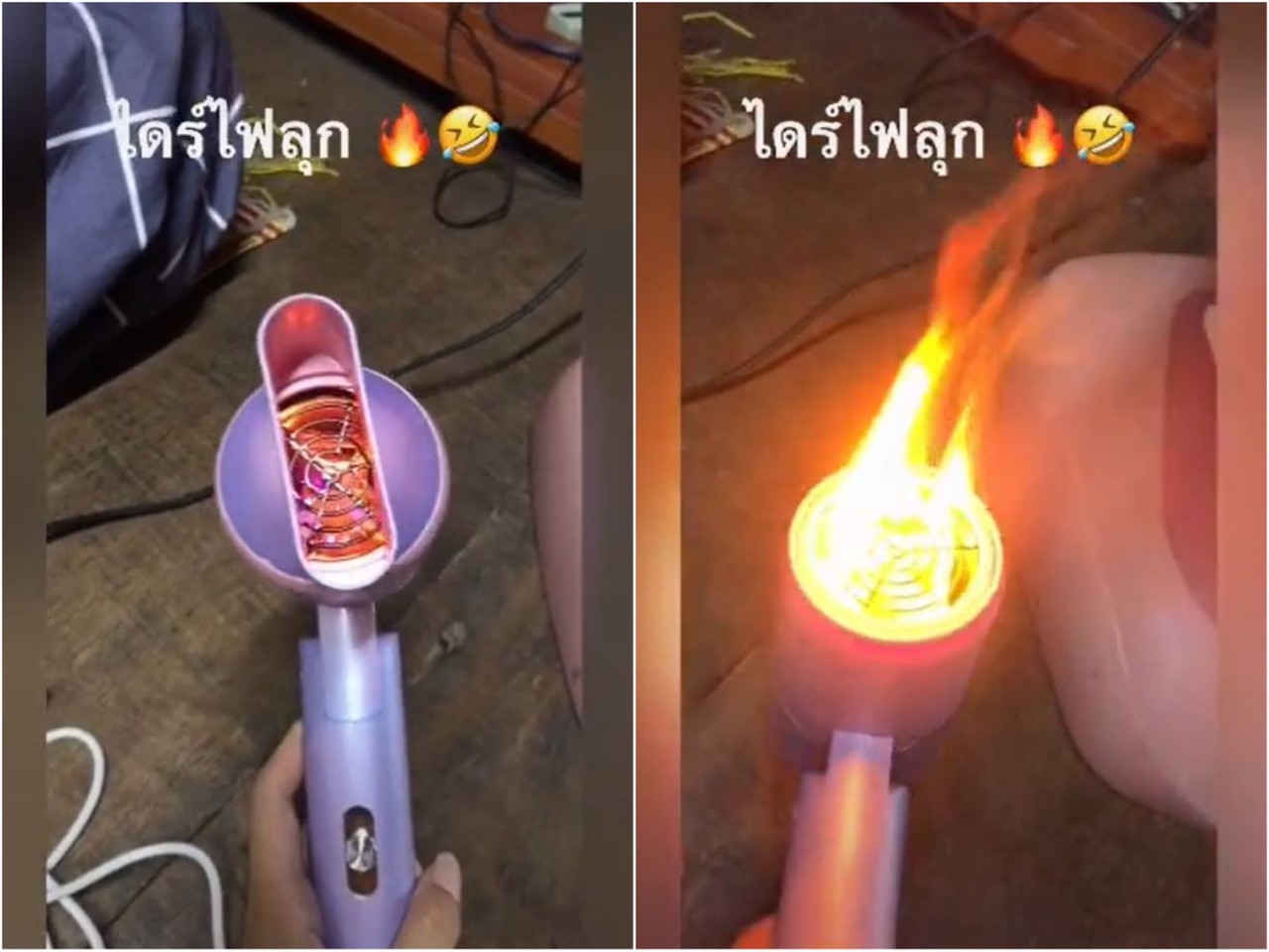 泰國女網友Oiwwi日前在TikTok上傳一段影片,原本以為是一段普通的吹風機開箱影片,怎料在適用到一半時,吹風機竟出現熊熊烈火,嚇得她馬上停止拍攝,並將將影片分享至網路上,笑言「吹風機太強力,直接起火」.由於過程太驚險被瘋傳,目前影片已累計超過百萬人次觀看。
