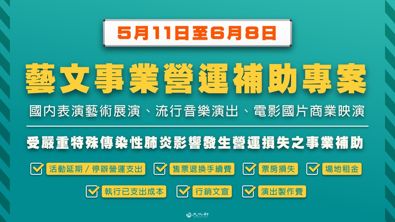 文化部對受嚴重特殊傳染性肺炎影響發生營運損失之事業補助申請須知:https://www.moc.gov.tw/information_250_127521.html