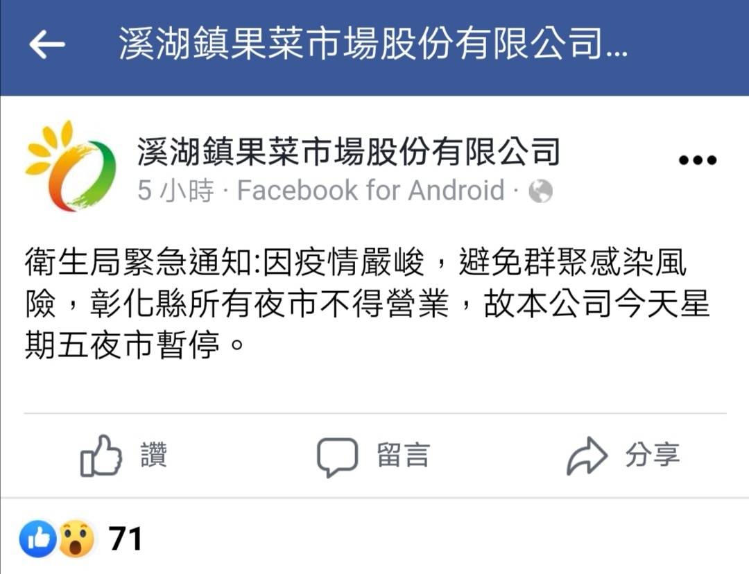下午公所也到附近大消毒,進一步證實確診傳聞,但在此同時,彰化縣政府同步宣布彰化縣50處夜市及公園全部停止營業,就連溪湖果菜市場也在臉書粉專公告,「因疫情嚴峻,避免群聚感染風險,彰化縣所有夜市不得營業,故本公司今天星期五夜市暫停」。這不得不讓人質疑與南彰化的確診案例有相當的關聯,縣長王惠美也進一步對地方喊話,務必遵守防疫相關規定。