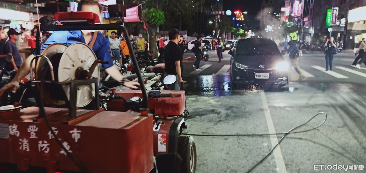 火警當時,休旅車剛好停在夜市路口,一度嚇到現場民眾,所幸火勢在晚間10時01分撲滅,無人員受傷,初判是行駛過程引擎內電線起火,詳細起火原因待查。