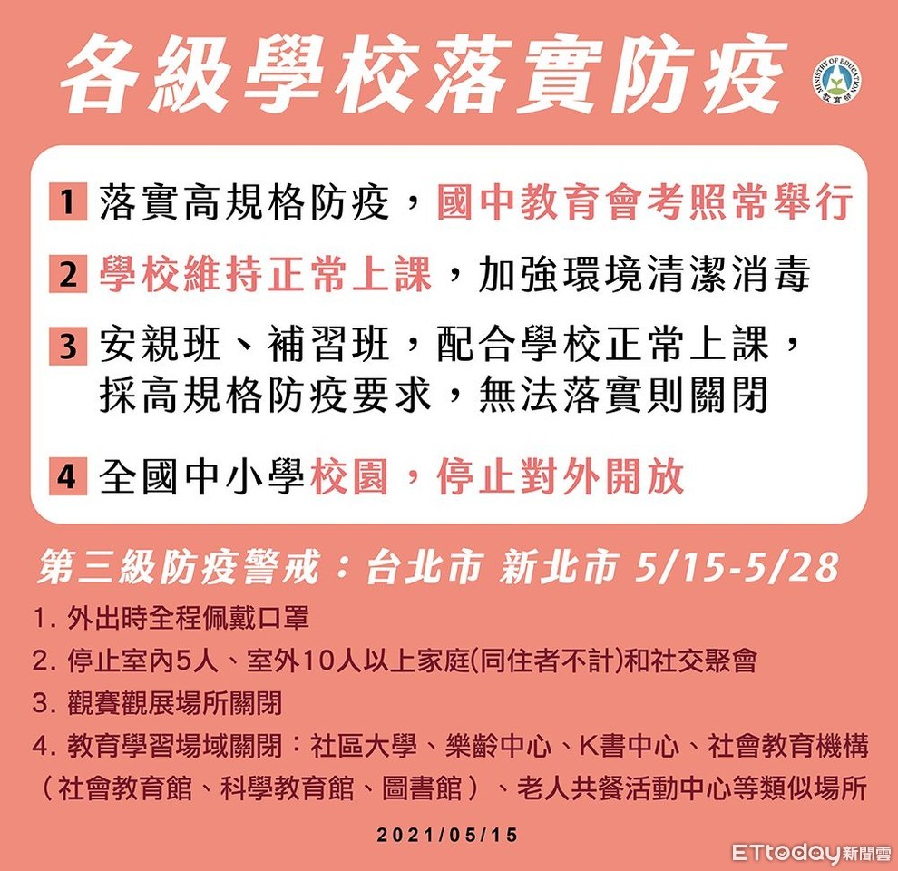 國內本土疫情延燒,指揮中心指揮官陳時中指出,因雙北陽性的篩檢率都偏高,警戒等級從15日起到28日升級為第三級警戒。教育部也在臉書上製圖PO文表示,學校維持正常上課,加強消毒,但全國中小學校園,停止對外開放,而社區大學、樂齡中心、圖書館等中心場所也將全面關閉。