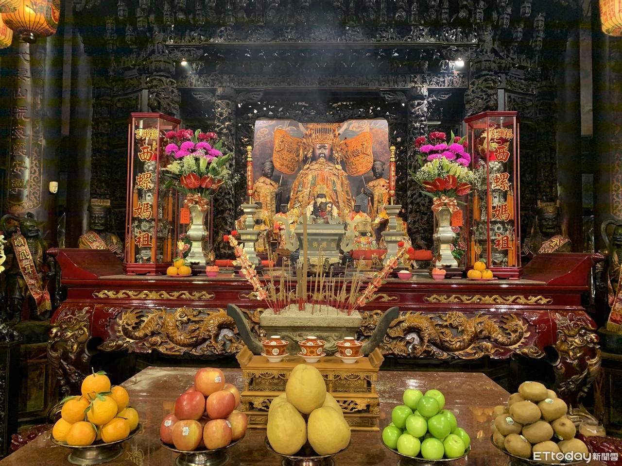 ▲西螺福興宮於中門佈置案桌、龍椅,將媽祖安奉於龍椅供信徒參拜。(圖/記者蔡佩旻攝)