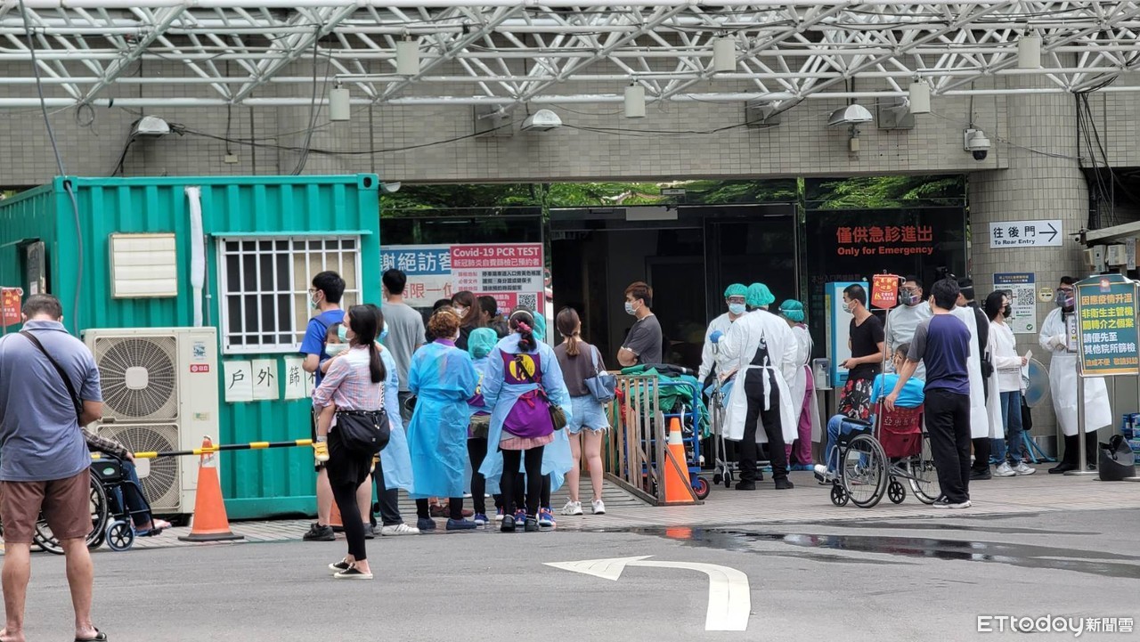 ▲板橋亞東醫院急診室門口民眾排隊篩檢。(圖/記者呂佳賢攝,下同)