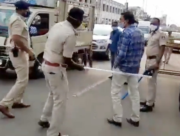 ▲印度比賈布爾(Vijayapura)員警棒打違規者。(圖/翻攝Twitter@KUSH40399166)