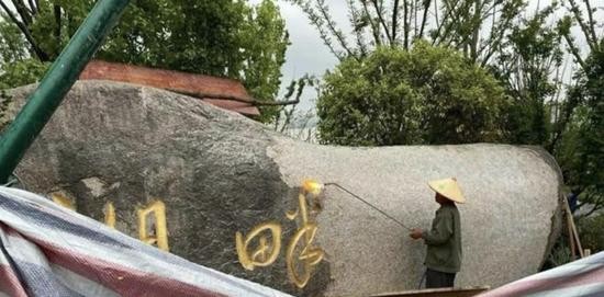 ▲大石頭上的湖畔大學四字遭工作人員抹去。(圖/翻攝新浪財經)