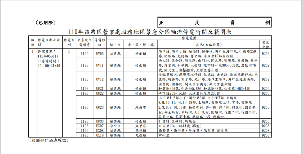 ▲台電公布苗栗受停電影響區域。(圖/台電提供)記者黃孟珍、林彥臣/苗栗報導台電公布,苗栗竹南、頭份、苑裡加上台中大甲將受到停電影響。停電時間為20:50~21:40。