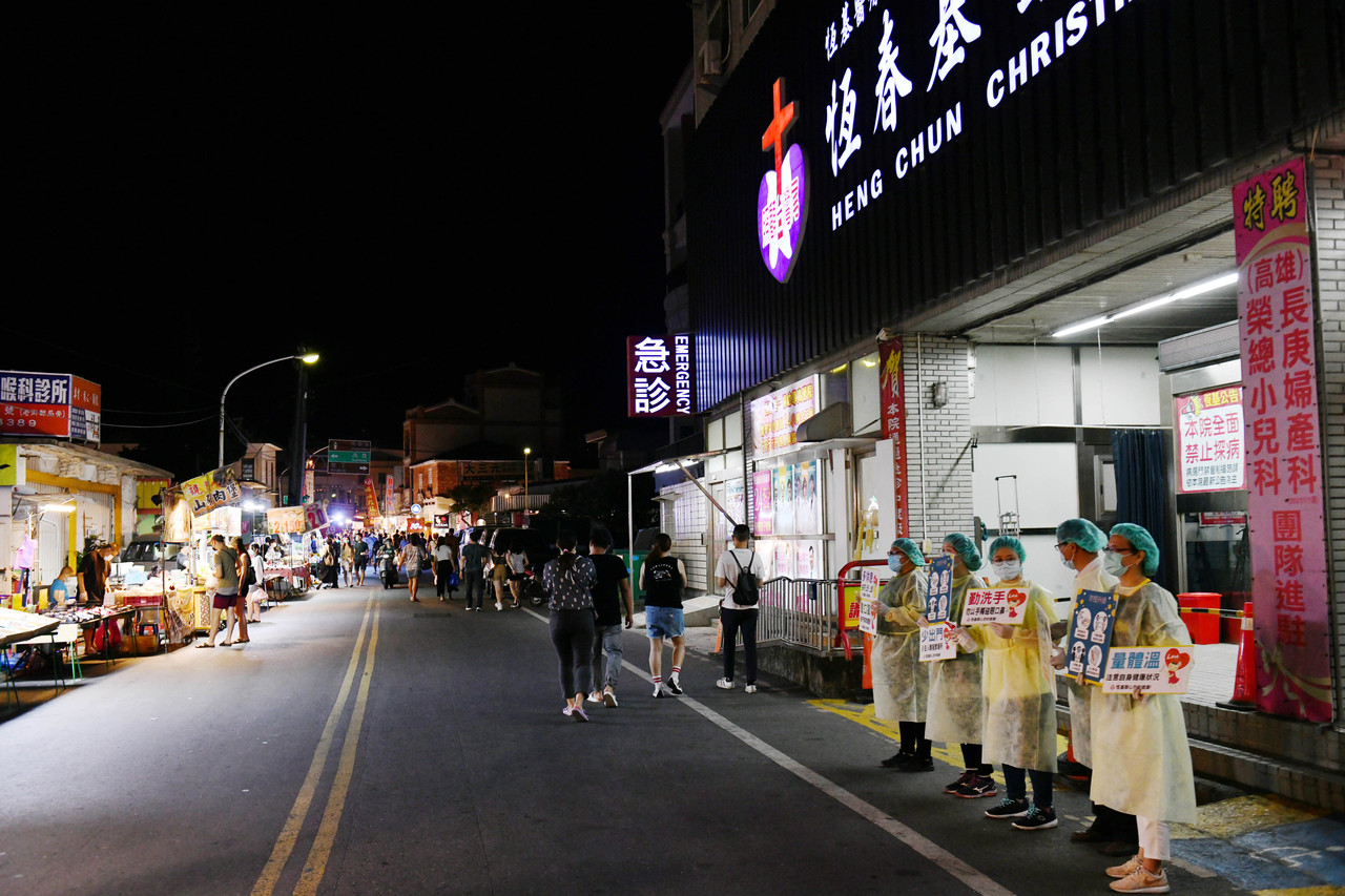 雙北疫情嚴峻,全民繃緊神經防疫,位在恆春鎮福德路及舊糖廠用地的恆春週日夜市16日如期開市,吸引不少民眾前來逛買;恆春基督教醫院位在夜市旁,從去年疫情面臨「恆春夜市」人潮借用人醫院廁所及進入休息等情事,基於防疫,醫院強勢拒絕民眾借用,今年疫情嚴峻更甚去年,夜市開張讓該院醫護巨大壓力,只能到門口用「人牆」宣導防疫並勸導非就診民眾不要進入醫院,引來關注。