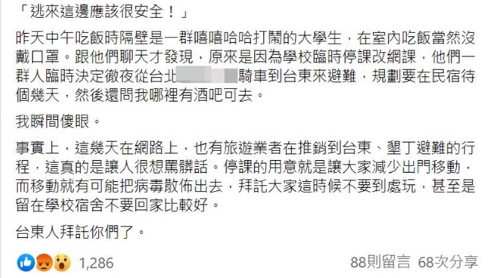 前議員王浩宇提到,「昨天中午吃飯時隔壁是一群嘻嘻哈哈打鬧的大學生,在室內吃飯當然沒戴口罩。跟他們聊天才發現,原來是因為學校臨時停課改網課,他們一群人臨時決定徹夜從台北的大學騎車到台東來避難,規劃要在民宿待個幾天,然後還問我哪裡有酒吧可去。」而王浩宇也說,自己當下聽到時,已經完全傻眼了。