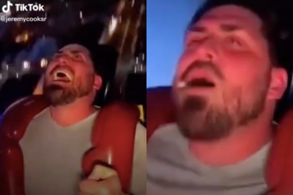 影片中可見,唐漢和一名年輕女子一同坐在椅子上,二人都張大嘴巴、頭髮亂飛,享受高空中的刺激感,此時卻有一顆白色物體自滿臉漲紅的唐漢嘴中飛出,雖然他趕緊將嘴巴閉上,但早已來不及,當下表情十分絕望。