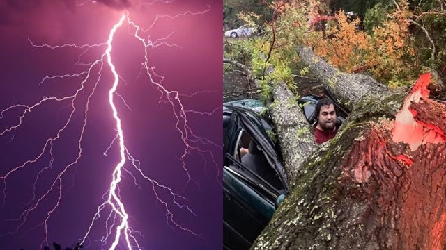 根據英國社交網路媒體《LADbible》報導,美國阿拉巴馬州蒙哥馬利市的獨角喜劇演員傑米(Henri Cheramie)於今年5月4日坐在自己的車內,當時該地正遭受一場風暴襲擊,不僅颳起強風、降下大雨,還伴隨著突如其來的閃電與打雷聲,正當見到天空又出現閃電時,他靈機一動站起身來,透過車內的天窗往外瞧,想要一探究竟外面到底發生何事。